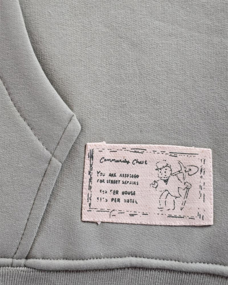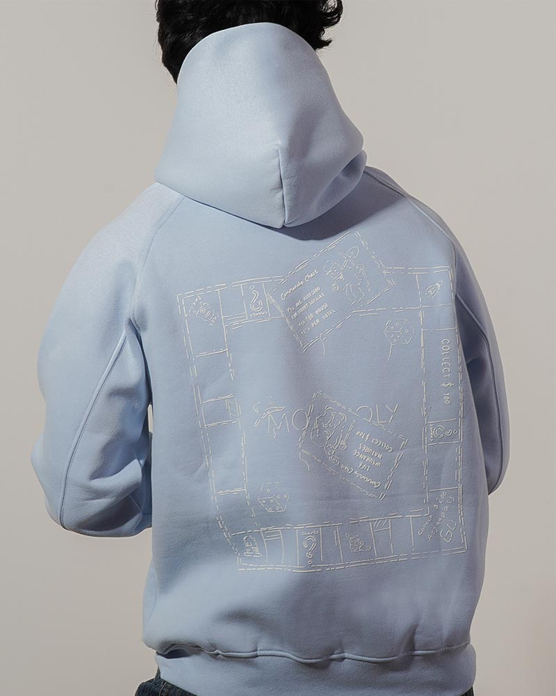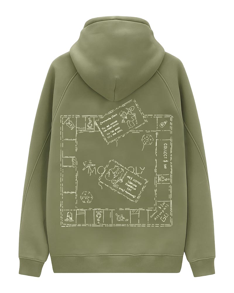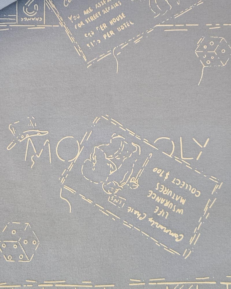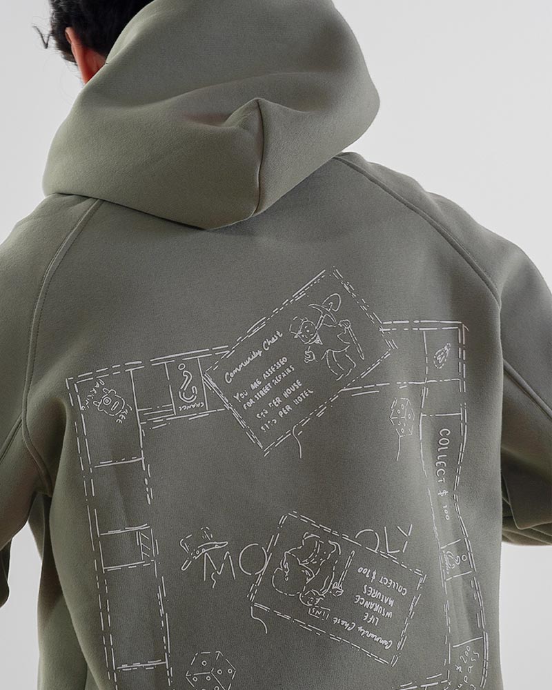 پشت هودی طرح صفحهی بازی مونوپولی رو شبیه به کوک دوزی چاپ کردیم و جلوش هم مارک پارچهای با تصویر یکی از کارتهای بازی دوختیم.
