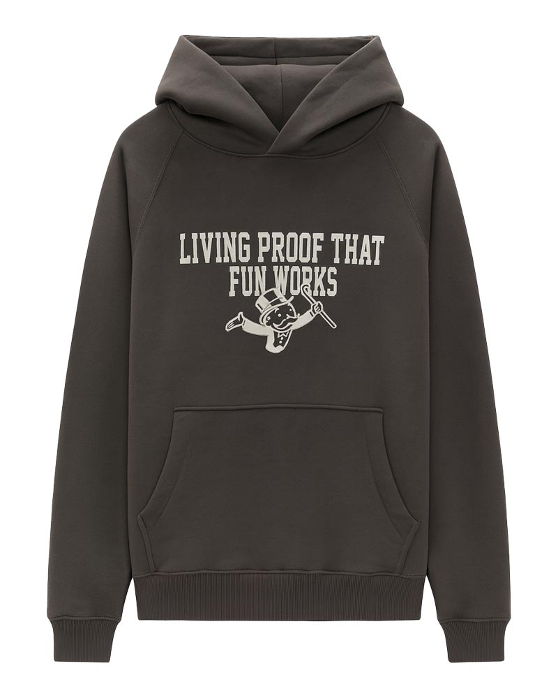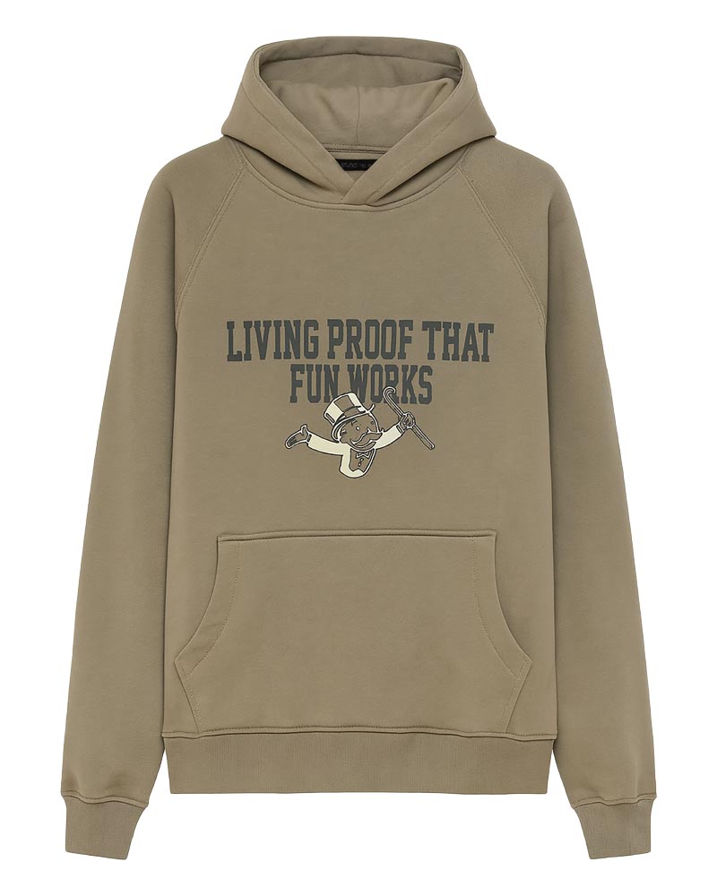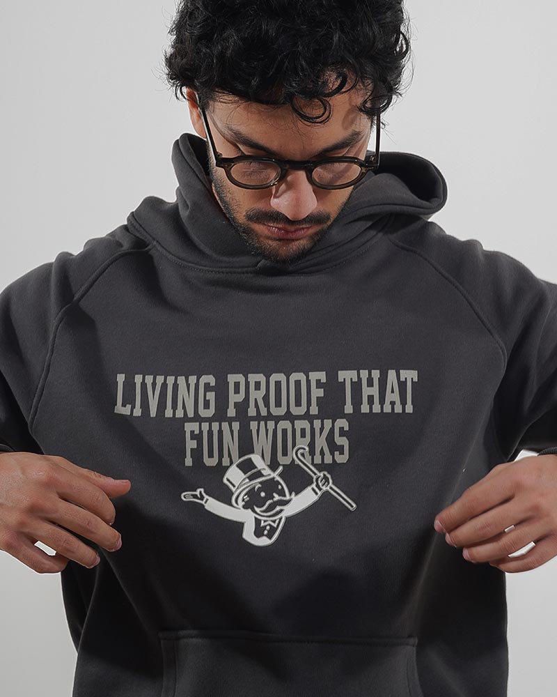 روی هودی نوشتیم: Living Proof That Fun Works — یعنی مدرک زندهای که نشون میده شادی واقعاً جواب میده!